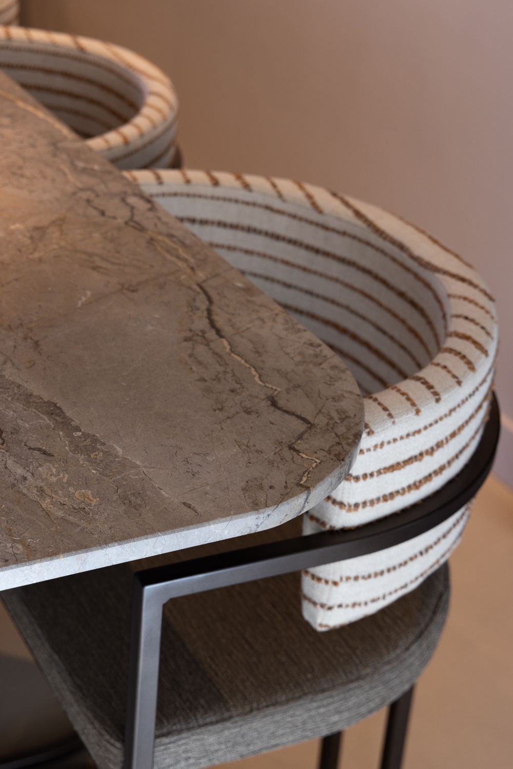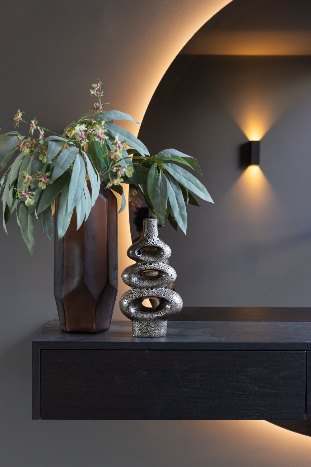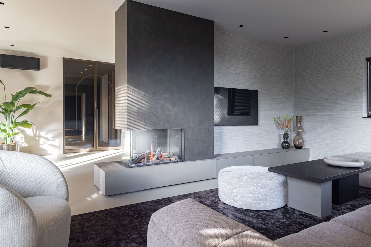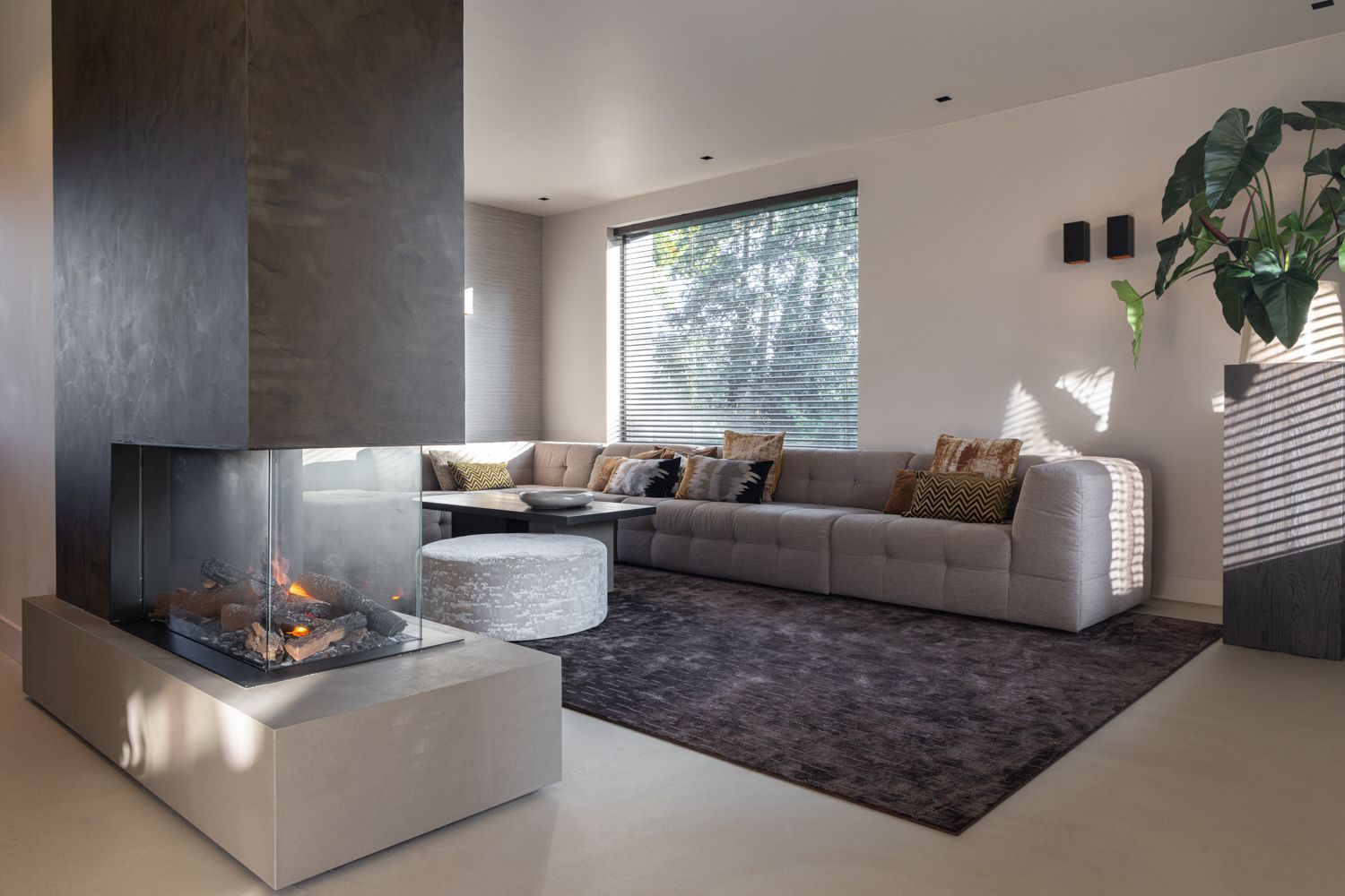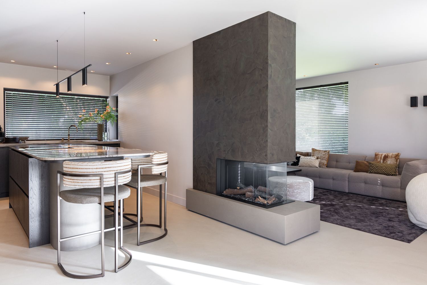 In deze woning komen warme tinten, rijke materialen en subtiele contrasten samen in een ontspannen hotel chique sfeer. Zachte stoffen worden afgewisseld met stoere, rauwe elementen zoals het natuursteen en de robuuste haard.