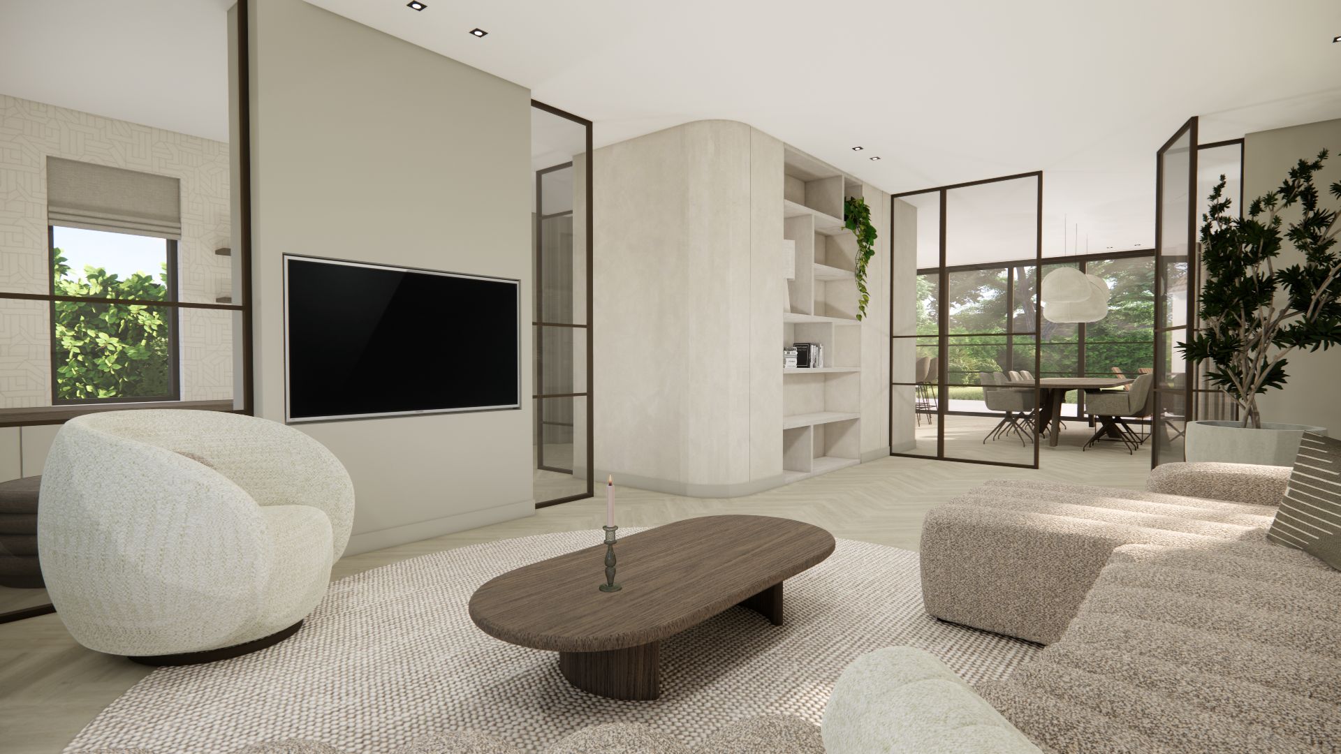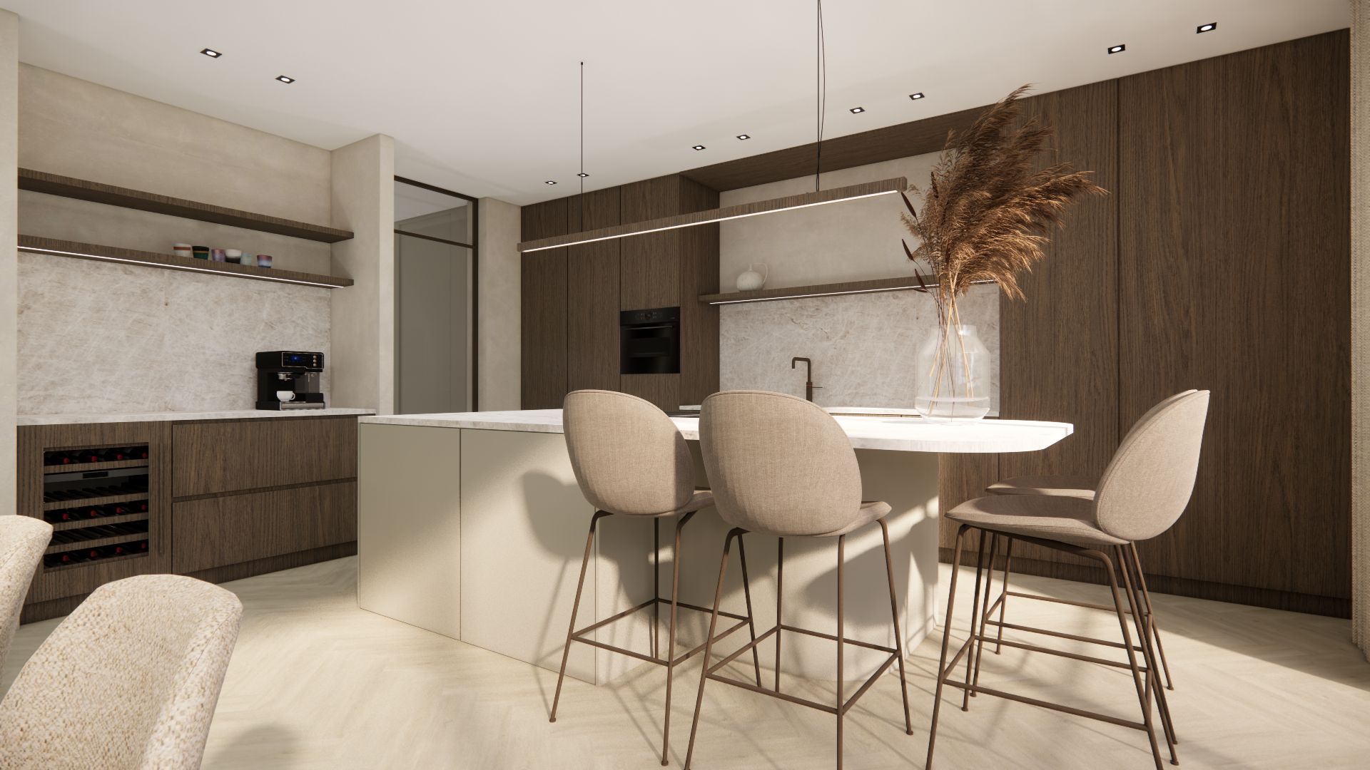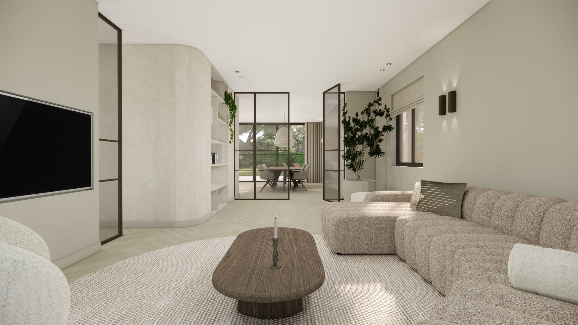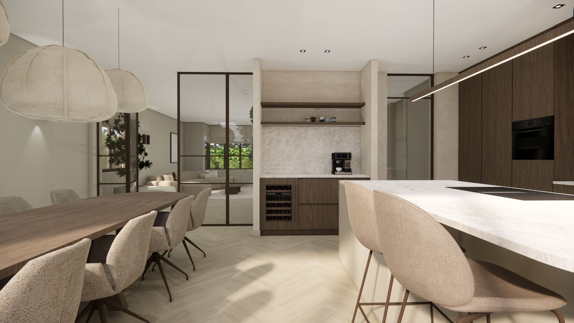 Met een palet van lichte beigetinten, donker hout en natuurlijke materialen ontstaat een serene basis die rust en warmte uitstraalt. De hoge glazen deuren zorgen voor een subtiele ruimtelijke verdeling, zonder het open karakter van de woning te verliezen.